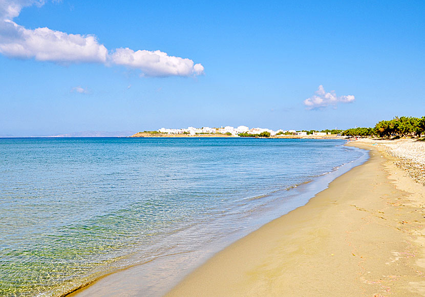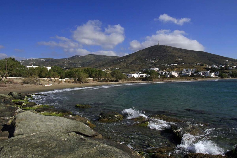 The central section features beach bars, tavernas, and water sports activities, while views towards the Church of Panagia Evangelistria add a distinctive touch, especially at sunset. An ideal choice for combining swimming with the convenience and atmosphere of the town.